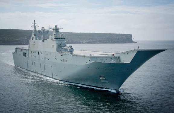 El barco, cuyo contrato se firmó en 2007, fue construido al 85% en los astilleros de Navantia en la Ría de Ferrol y terminado en Australia a cargo de BAE Systems. Fue trasladado a Australia en agosto de 2012 y aceptado por la Commonwealth de Australia el día 3 de octubre. La construcción de estos buques ha supuesto para Navantia la entrada en el mercado especializado de este tipo de barcos, que se ha consolidado con la elección del diseño del LHD español por parte de la Marina Turca, y el mejor escaparate de Navantia en Australia, donde tiene importantes intereses comerciales.
