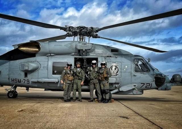Fotografía: La tripulación mixta de la Armada y la US Navy delante de un MH-60R del HSM-79. (foto US Navy)