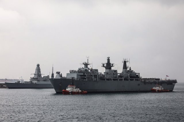Cuando este gran navío de tipo LPD (Landing Platform Dock) atracó bajo una intensa lluvia, ya estaba presente en los muelles militares de la Colonia otra de las unidades de la Royal Navy, el moderno destructor del tipo 45 HMS “Diamond” (D34), que había arribado la tarde anterior y que también realizando una escala para repostar y descanso de la dotación, en su camino de vuelta a la principal de las instalaciones de la Royal Navy la denominada HMNB Portsmouth, donde tiene su puerto base. El navío llevaba en la mar desde el pasado verano, operando primero en el Mar Báltico y posteriormente en el Mediterráneo, principalmente en Chipre, donde los británicos también mantienen bases permanentes.