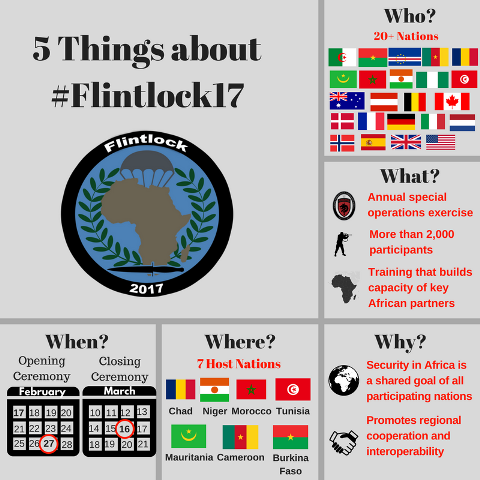 Más de 2.000 efectivos de más de una veintena de naciones, entre ellas España, van a participar en el macro ejercicio de operaciones especiales Flintlock 17 que, organizado por el AFRICOM, se desarrollará en siete países del Magreb y el Sahel. El ejercicio, que comienza a primeros de marzo y se prolongará hasta mitad de mes, ha sido planeado y se desarrollará bajo las órdenes del Africa Command (AFRICOM), el mando de los Estados Unidos que tiene asignado las operaciones militares de sus fuerzas en este continente.