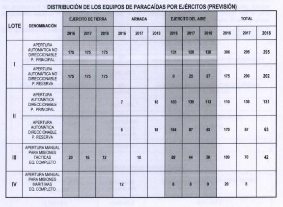 Los importes estimados para estos cuatro lotes son 4,6 millones para el lote 1, 2 millones para el lote 2, 3,2 millones para el lote 3 y 315.000 euros para el lote 4. En tabla anexa se desglosan la distribución prevista de estos equipos de paracaídas entre los tres Ejércitos y entre los años 2016, 2017 y 2018 extraída del Pliego de Cláusulas Administrativas Particulares (PCAP) que acompaña a la licitación.