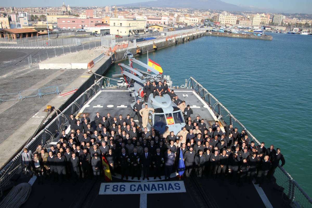 (defensa.com) A primera hora de ayer, del 16 de noviembre, Pedro Morenés visitaba la fragata de la Armada Canarias en el puerto de Catania (Sicilia), donde recaló para abastecerse y dar un descanso a su dotación. El navío español está participando en el dispositivo militar de la UE para la lucha contra el tráfico ilícito de personas en el Mediterráneo Central Meridional, operación denominada EUNAVFOR MED, junto otros navíos europeos, de hecho en la instalación portuaria también pudimos ver la fragata de la Royal Navy británica HMS Richmond F-239.