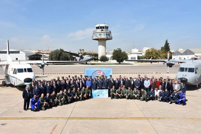 Fotografía: Los protagonistas del acto posan con el cartel de las 100.000 horas de vuelo y dos “Aviocar”. (foto: Base Aérea de Alcantarilla, Julio Maíz/defensa.com)