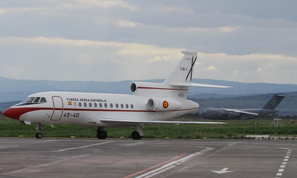 ·Momento de la llegada del Falcon 900 con el ministro Morenes a bordo, al fondo se puede ver un transporte Boeing C-17A “Globemaster III” de la USAF.