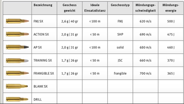 Los tipos de munición ofrecidos por el fabricante para el arma (H&K)