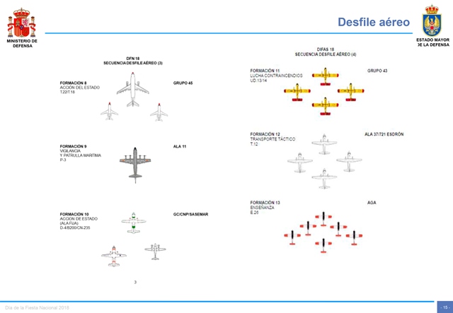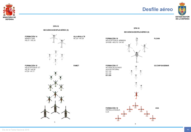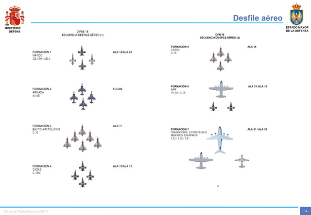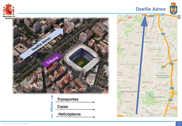 La parada proseguirá con el desfile aéreo en el que, en esta ocasión, participarán 88 aeronaves entre cazas, aviones de transporte y helicópteros que sobrevolarán el Paseo de la Castellana en dirección surnorte.