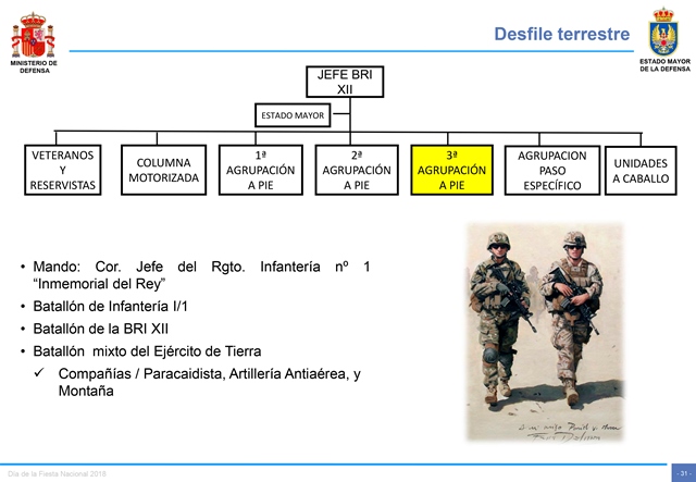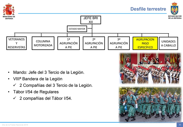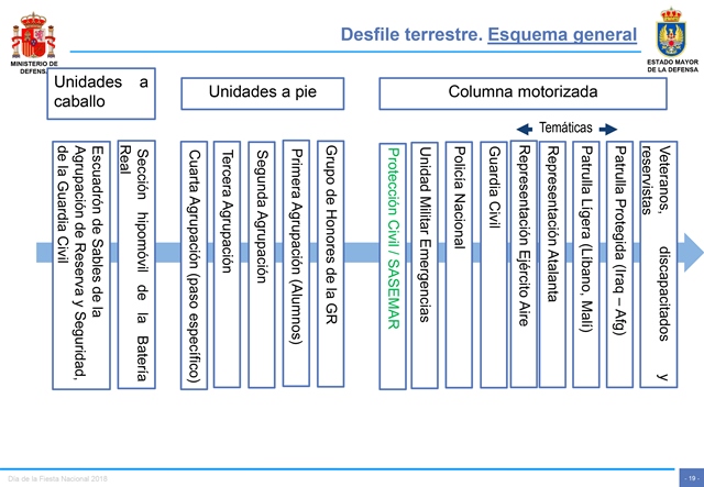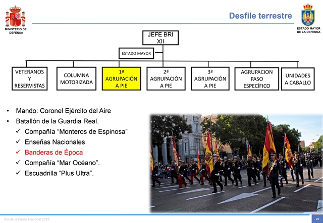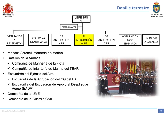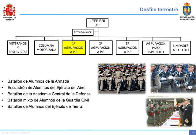 Finalizado el recorrido de los vehículos, comenzará el desfile a pie ante SS. MM. los Reyes de las cuatro agrupaciones de las diferentes unidades de los Ejércitos, la Armada y la Guardia Civil. Las tres primeras desfilarán a paso ordinario, y la cuarta –integrada por la Legión y los Regulares-, lo hará a paso específico.