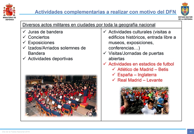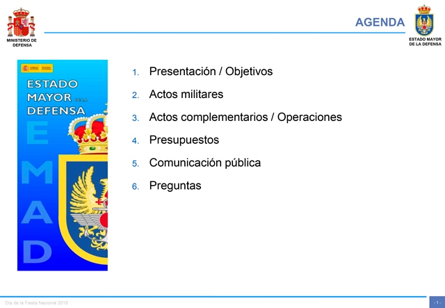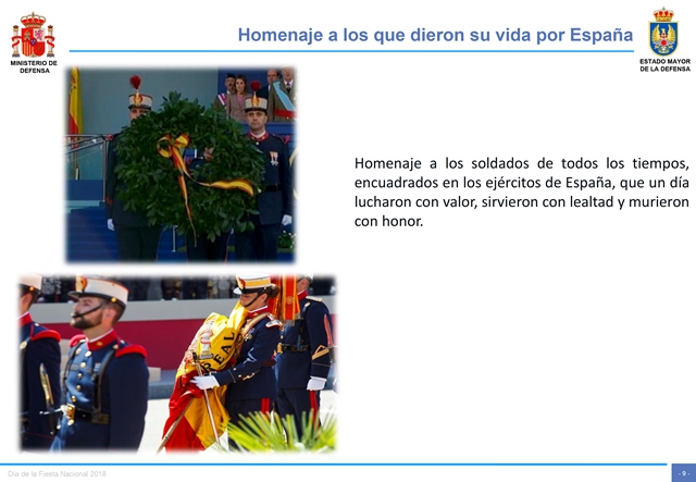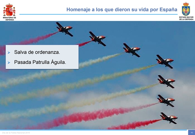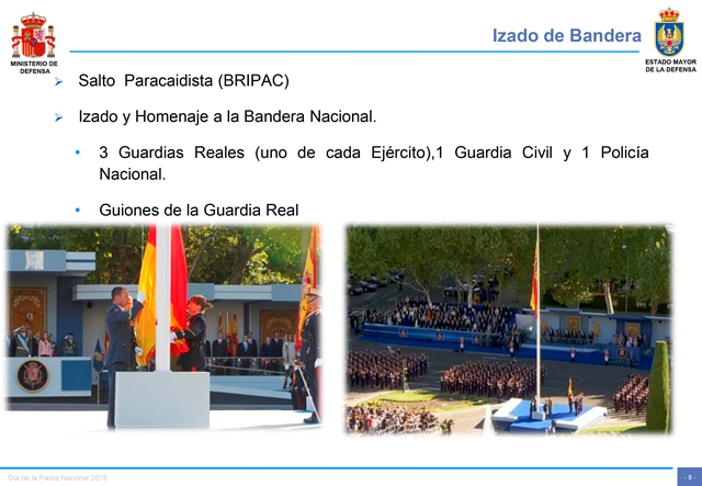 La parada militar se iniciará con un salto paracaidista en la Plaza de Lima, dónde estará ubicada la Tribuna Real. Efectivos de la Brigada Paracaidista portarán en su descenso la enseña nacional. Y, a continuación, se procederá al solemne izado de la bandera que dará paso al homenaje a los que dieron su vida por España, y que, como es tradicional, terminará con la pasada de la ‘Patrulla Águila’.