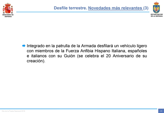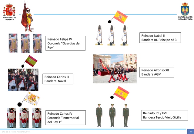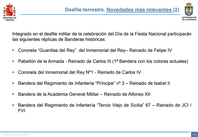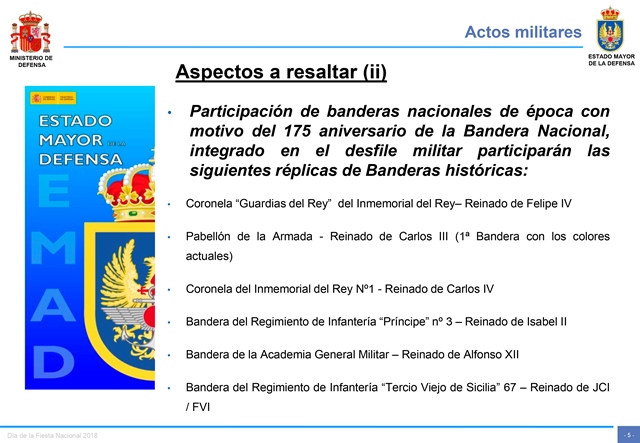 Este año, y con motivo del 175 aniversario de la bandera nacional, se han incorporado a esta parte del desfile seis banderas nacionales de época y representativas de diferentes momentos históricos de España. Por otro lado, se hará especialmente visible la presencia de la mujer en el Ejército. Potenciando su participación en el desfile, a modo de homenaje por el 30 aniversario de su incorporación a las Fuerzas Armadas.
