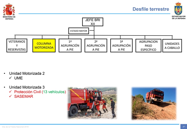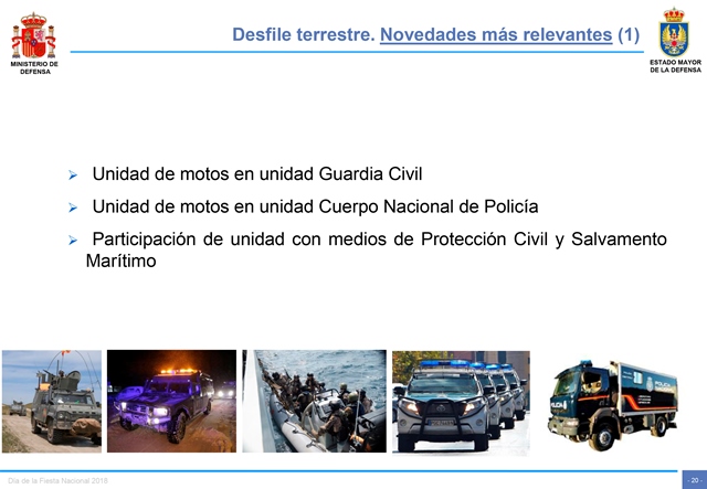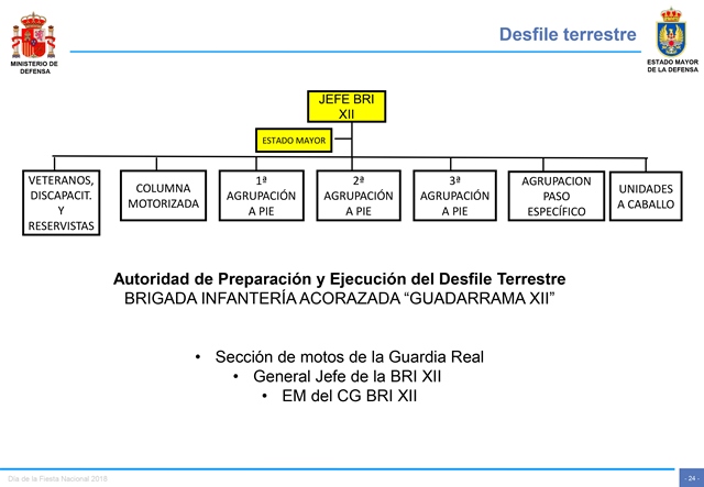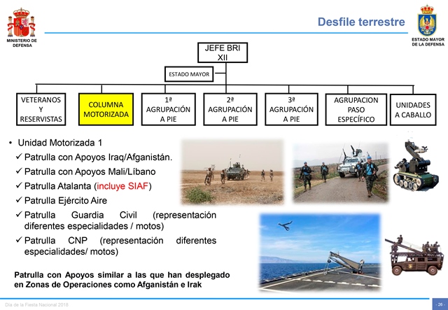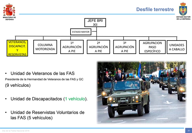 Por su parte, el desfile terrestre se abrirá con un componente mecanizado integrado por 152 vehículos, al mando del general jefe de la Brigada Acorazada “Guadarrama XII”. Abre el desfile, una Unidad de Veteranos de las Fuerzas Armadas y de la Guardia Civil, una Unidad de Discapacitados y otra de Reservistas Voluntarios. También se exhibirá una muestra de las patrullas temáticas con vehículos de apoyo similar a las que han desplegado en zona de operaciones como Afganistán e Iraq.