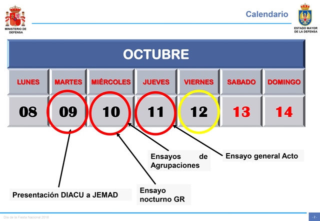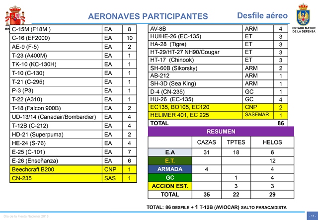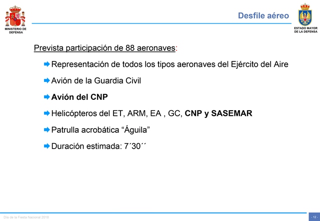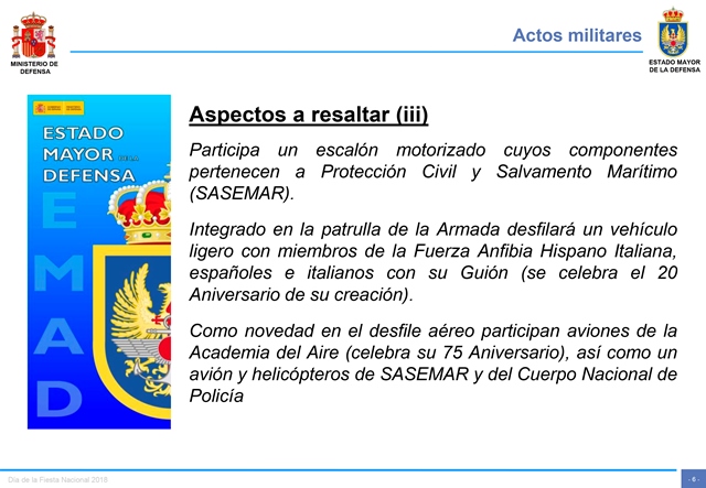 Unos 4.000 militares de los tres Ejércitos, 88 aeronaves y 152 vehículos, además de efectivos de la Guardia Civil, de la Policía Nacional, Protección Civil y Salvamento Marítimo, participarán el próximo viernes en Madrid en el desfile de conmemoración del 12 de octubre, Día de la Fiesta Nacional.