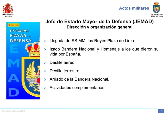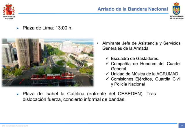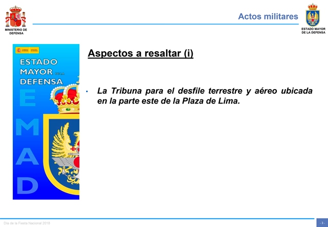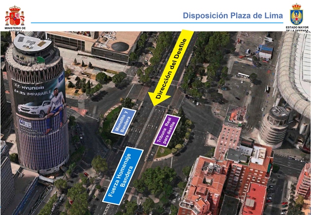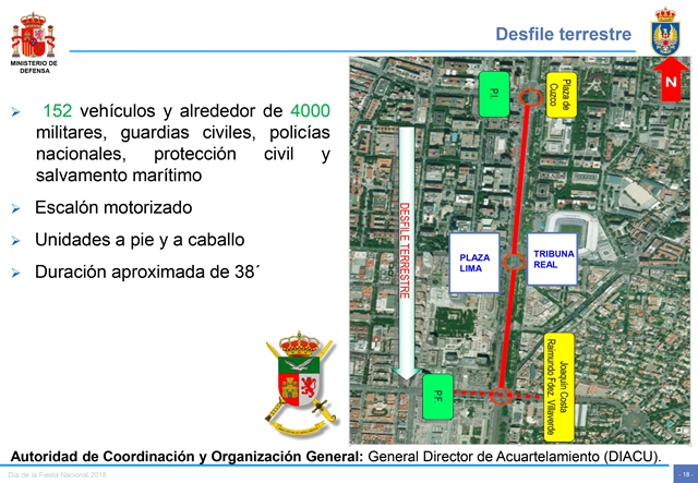El acto estará presidido por SS. MM. los Reyes, que estarán acompañados por el presidente del Gobierno, Pedro Sánchez, los presidentes del Congreso y del Senado, ministros y autoridades militares, autonómicas y locales. El desfile, que comenzará a las 11,00 horas, tendrá su punto de partida en la Plaza de Cuzco. Desde este enclave, las diferentes unidades recorrerán los más de 2 kilómetros de los que consta el itinerario y que concluirá en la Plaza de San Juan de la Cruz.
