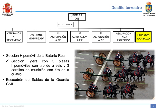 En un segundo bloque, las unidades a caballo tomarán el relevo. La sección hipomóvil de la Batería Real y el Escuadrón de Sables de la Agrupación de Reserva y Seguridad de la Guardia Civil desfilarán ante SS. MM. los Reyes. Como broche final, la ‘Patrulla Águila’ sobrevolará el itinerario del desfile y se arriará la bandera nacional para poner el punto final a la celebración del Día de la Fiesta Nacional. Por otro lado, según los datos facilitados por el Estado Mayor de la Defensa el coste estimado del desfile del Día de la Fiesta Nacional asciende a 423.729 euros. A esto habría que sumarle los 200.539 euros del coste de las gradas y tribunas.