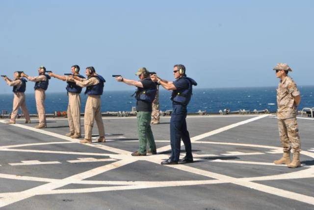 Fotografia: Oficiales pilotos de helicóptero y UAV realizan tiro con pistola a bordo del buque "Galicia" (Armada española)