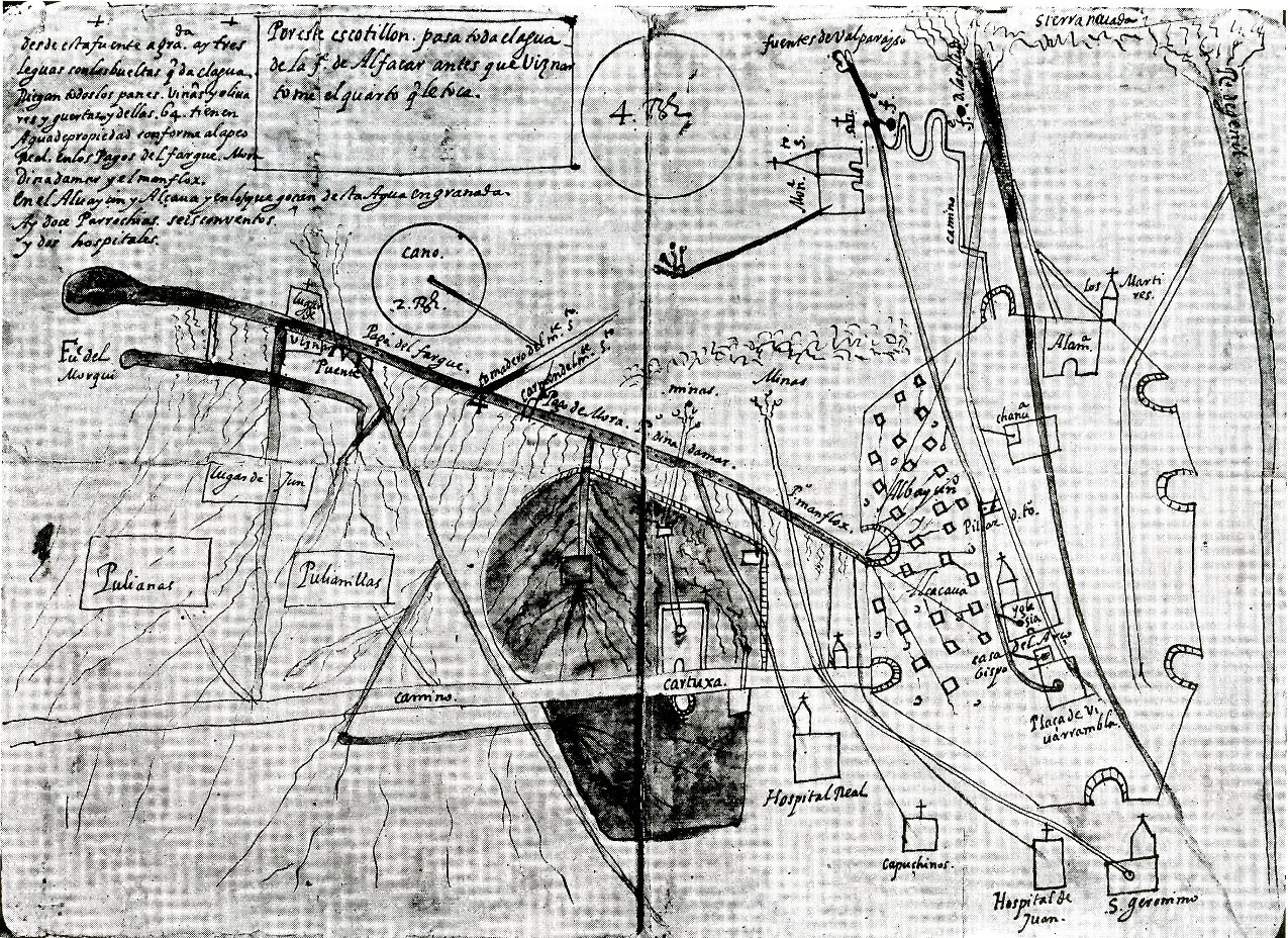 Plano de la acequia de Aynadamar hacia 1575 según el apeo de Loaysa (“La Granada morisca”, 1575)