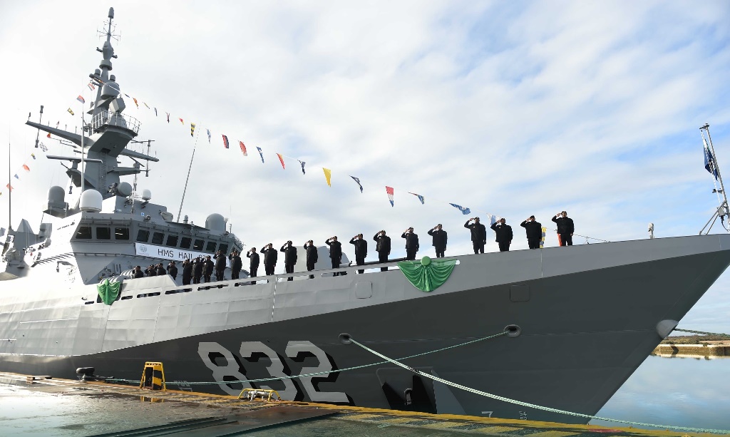 Ceremonia de entrega de la tercera de las corbetas sauditas, un programa fruto de las larga experiencia de Navantia. (foto Ministerio de Defensa de Letonia)