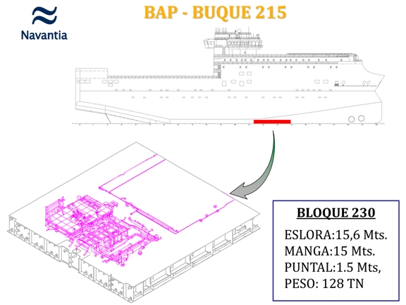 El bloque que se ha colocado en la grada, cuya chapa empezó a cortarse el pasado 22 de mayo, es el bloque 230, con una eslora de 15,6 metros, manga de 15 metros y peso de 128 toneladas, perteneciente al doble fondo de la cámara de máquinas. El buque flotel es un buque polivalente y tecnológicamente avanzado, con capacidad para alojar durante largos períodos de tiempo a unos 700 trabajadores de las plataformas petrolíferas utilizadas por PEMEX. El buque, caracterizado por su capacidad de posicionamiento dinámico DP3, tiene como misión principal, ofrecer un máximo confort en alta mar, por lo que cuenta con camarotes, salas de ocio y esparcimiento que permiten asegurar ese alto nivel de habitabilidad requerido.