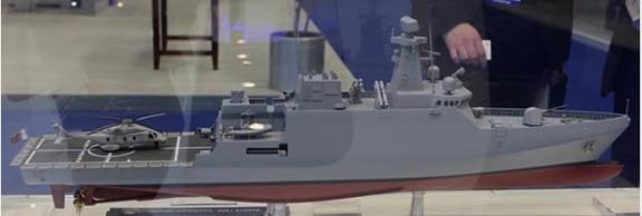 Se podían distinguir a proa el cañón principal de 76 mm. y tras de este las celdas de un sistema de lanzamiento vertical de misiles, dos lanzadores cuádruples de misiles anti-buque, un radar de vigilancia tridimensional y un lanzador de misiles antiaéreos de corto alcance sobre el hangar para el helicóptero. El diseño estilizado con ausencia de protuberancias y el mástil integrado sugiere la apuesta por un diseño de baja firma radar. La cubierta de vuelo puede recibir un helicóptero medio del tipo NH-90, dispone de sistemas de comunicaciones por satélite y dos embarcaciones inflables de casco rígido del tipo RHIB .