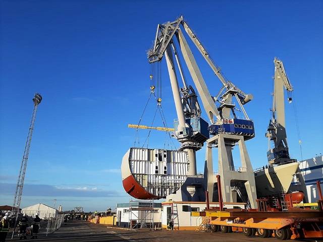El acto interno ha comenzado a las 08.30 horas de la mañana y se ha desarrollado sin contratiempos en la grada 3. Han asistido, entre otros, el director del Astillero Bahía de Cádiz, Javier Herrador; el director del programa en Navantia, Vicente Martínez Caridad; y el capitán Abdullah Alshehri, director de la Oficina del programa saudí. Con la puesta de quilla de hoy (bloque 101) comienza la construcción en grada del penúltimo buque de este programa. En este caso, será la C549 y llevará por nombre JAZAN. Hay que destacar que este bloque ha sido construido en Navantia Puerto Real, fruto de la colaboración entre ambos astilleros de la Unidad de Negocio del Astillero Bahía de Cádiz en este programa. El módulo fue trasladado hasta el astillero de San Fernando el pasado fin de semana.