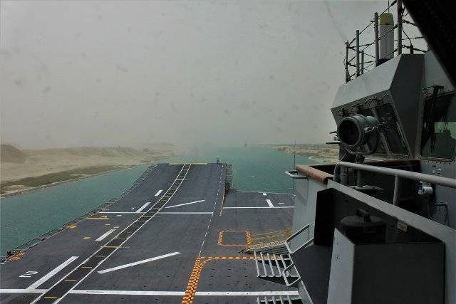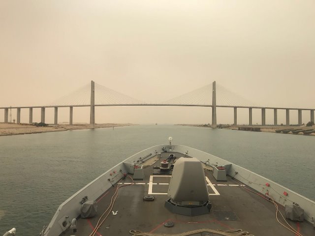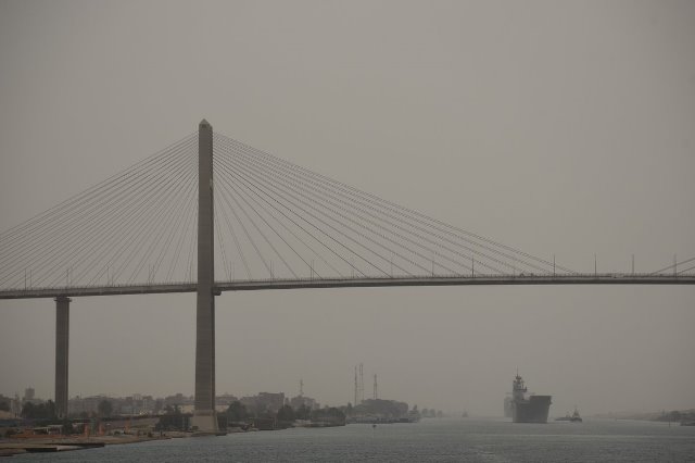 En el curso del periplo entre la Base Naval de Rota (Cádiz) y el puerto kuwaití de Shuaiba, donde está Camp Sperhead, gran base logística del US Army donde se pondrán en vuelo los helicópteros, la Armada informó el 11 de mayo que ambos buques habían cruzado el Canal de Suez. En las imágenes puede verse al LHD pasando bajo el macro puente del Canal de Suez, también llamado de la Amistad entre Japón y Egipto, ya que fue principalmente financiado por el Gobierno de Tokio e inaugurado en 2001, consiguiendo una mejor comunicación del Sinaí por carretera, a la altura de las localidades egipcia de Al-Qantara el-Sharqiyya. Aunque franquear los 163 kilómetros de longitud que tiene el Canal parece una cosa rutinaria, todos los navíos que lo hacen toman medidas extras de seguridad ante el riesgo de atentados terroristas, un riesgo que ha aumentado desde hace años por la creciente presencia de terroristas islámicos en el Sinaí vinculados al Daesh.