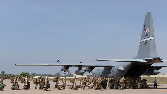 ·Fuerzas de los Marines suben a un C-130H Hercules del ANG de Kentucky. Foto: USAF.