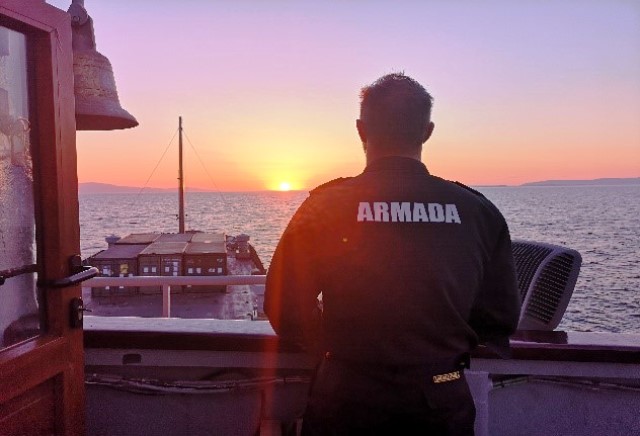 - Un miembro de la dotación del “Martín Posadillo” observa la proa del navío, que va llena de contenedores. (foto EMAD)