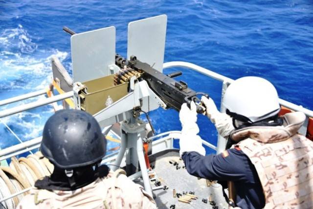 - El “Martín Posadillo” está armado con ametralladoras Browning de 12,70 mm, aquí vemos una manejada por un miembro de la dotación y un infante de Marina del citado EOS. (foto EMAD)