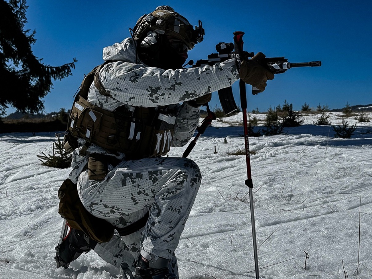 Estamos ante un completo traje que incluye capucha, de color blanco mate para evitar reflejos, con estampados de tipo nival y, a tenor de las imágenes, con un discreto pixelado oscuro. Además, como hacen sus compañeros del MTM, rompen la estética de sus fusiles de asalto a larga distancia colocándoles tiras adhesivas blancas, al igual que en el casco y el chaleco portaplacas.