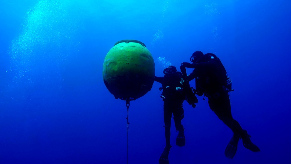 Buceadores de la UBMCM eliminando la amenaza que constituye una mina de orinque (Armada española)
