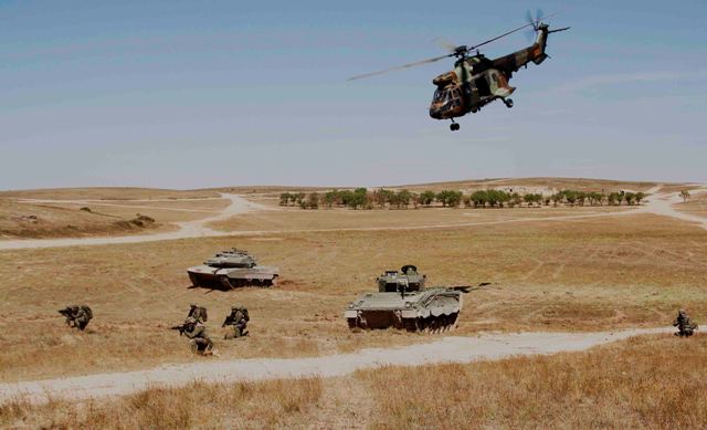 2- Carros de combate Leopardo (derecha) un VCI Pizarro, infantería y un Super Puma. Foto Brigada “Aragón” I.