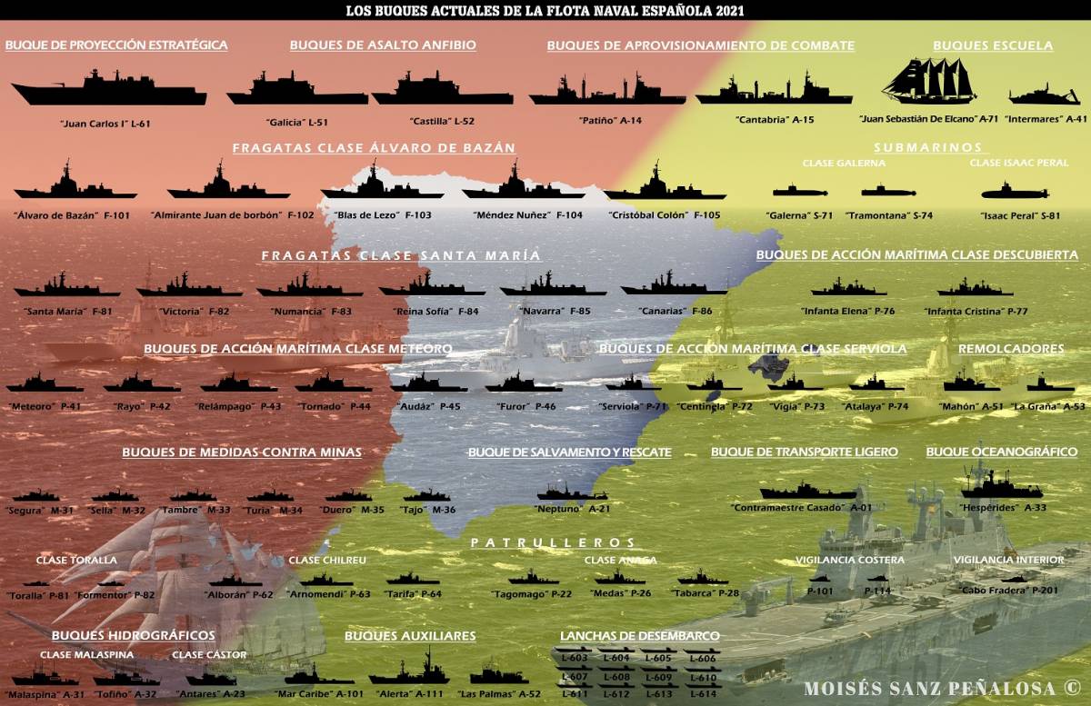El marinero destinado en la Oficina de Prensa de la Armada Moisés Sanz Peñalosa ha elaborado para la Armada española una interesante lámina ilustrativa que permite conocer la lista de buques que forman la flota naval española.