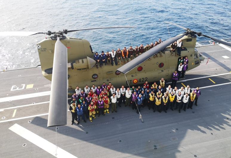 La Aviación del Ejército de Tierra español ha aprovechado la misión de la Armada española “Dédalo 23” para embarcar en su buque anfibio portaaeronaves “Juan Carlos I” varios de sus helicópteros y, por vez primera, uno de sus nuevos helicópteros Boeing CH-47F Chinook.