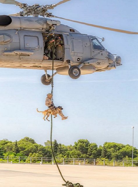 Otro de los entrenamientos a los que se ha sometido a los perros es el de su traslado y despliegue desde helicópteros a la zona de acción. Así, tras realizarse durante el ejercicio GNEX-01/20 la práctica desde un SH-3D Sea King, la semana pasada se repitió utilizando un Sikorsky SH-60B Seahawk de la Décima Escuadrilla. En ambas ocasiones, la reacción de los canes fue perfecta, tras embarcarse en las aeronaves, en tierra ejecutaron perfectamente la “neutralización” del supuesto enemigo.