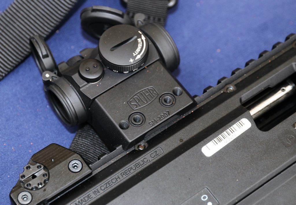 Detalle de la mira Aimpoint Micro T-2 2MOA del subfusil CZ Scorpion Evo 3 A1. (foto Julio Maíz Gutiérrez)