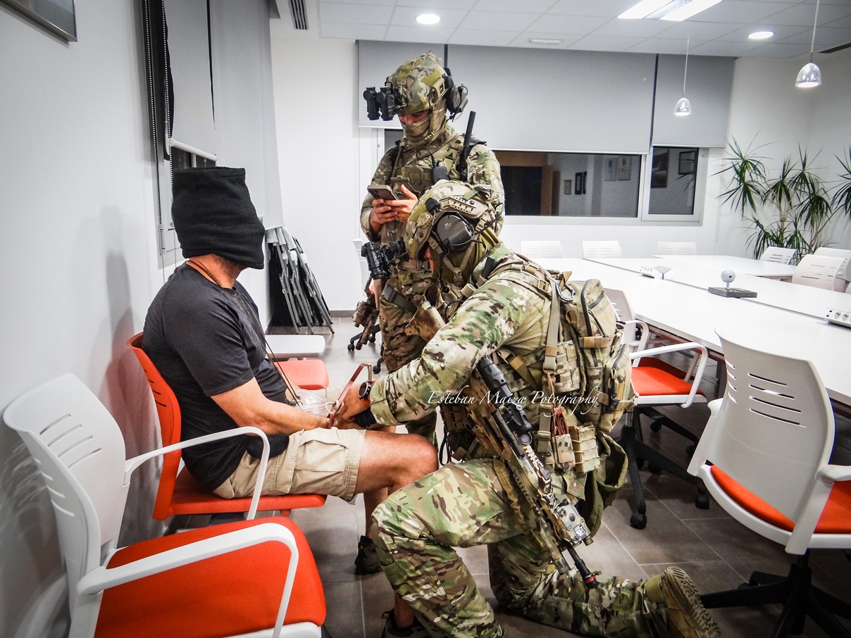 Justo antes de que un operador abriese la penúltima puerta, sale de ella un hostil armado que le dispara en el cuello antes de ser eliminado por el resto del equipo. “Paramédico arriba, tenemos una baja”, grita otro miembro del equipo, pero desde dentro de la habitación siguen abriendo fuego contra ellos. Antes de empezar a atender a su compañero herido, que grita del dolor en el suelo, los operadores españoles tienen que ganar el tiroteo.