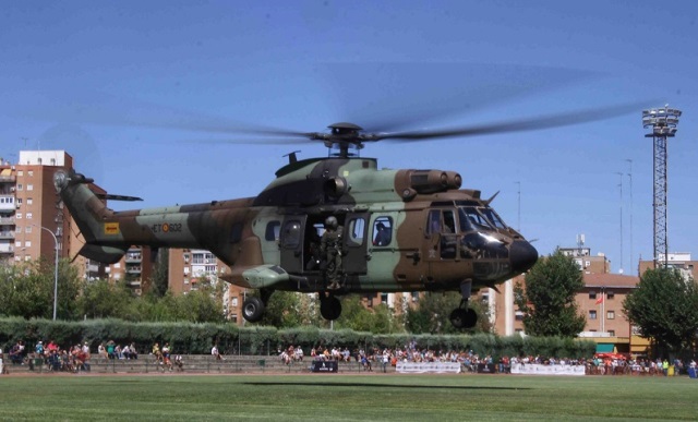 ·El helicóptero AS532 Cougar de las FAMET despegando del polideportivo de Alcalá de Henares. Foto: Julio Maíz/defensa.com