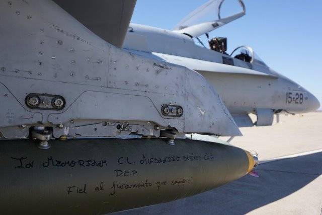 Los armeros del Ala 15 han rotulado una de las bombas que montaban en un EF-18M en memoria del caballero legionario Alejandro Jiménez Cruz, que falleció en el curso de unas maniobras en Alicante el pasado 25 de marzo. El joven militar de la Legión española falleció el lunes a causa de las heridas provocadas por un disparo fortuito en el transcurso de unas maniobras militares en Agost (Alicante).