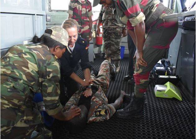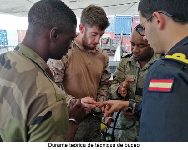Respecto a las actividades de apoyo al adiestramiento, la dotación del “Atalaya” trabajó de manera conjunta con la Marina local realizando ejercicios en las áreas de asistencia sanitaria en combate, operaciones de abordaje marítimo, buceo, maniobra general del buque y navegación. Para ello se impartieron conferencias, se explicaron procedimientos y se realizaron diversos ejercicios prácticos enfocados a mejorar las capacidades operativas de las Fuerzas Armadas de Gabón.