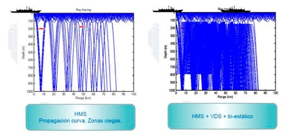 La detección de submarinos basada en el uso de sónares es una disciplina compleja que requiere de alta tecnología y de dotaciones entrenadas, de lo contrario es relativamente fácil una intrusión no deseada aprovechando la existencia de “zonas ciegas”, como bien conocen los implicados en esta área naval. Estas “zonas ciegas” pueden reducirse al máximo explotando los últimos avances tecnológicos y utilizando de manera integrada las plataformas y sus sensores puestos al servicio de la fuerza, es lo que se conoce como “ASW – Network Centric Warfare”. El uso extensivo de drones UAV, USV y UUV como sensores remotos integrados, el procesado bi-estático y multi-estático mediante el uso de sonoboyas y sónares de profundidad variable de todos los integrantes de la fuerza, el procesamiento combinado de señales en baja y media frecuencia y unas comunicaciones en banda ancha robustas, es decir, con bajo índice de fallo, son las nuevas tendencias en sensores submarinos que permiten alcanzar unos escenarios de detección mucho más completos y efectivos.