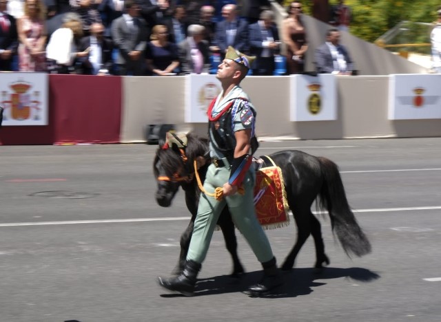 Vimos tras ellos la participación de las agrupaciones a pie del Grupo de Honores de la Guardia Real, un Batallón Mixto de la Armada, un Escuadrón Mixto del Ejército de Aire, un Batallón de Alumnos de la Guardia Civil, una compañía de la Unidad Militar de Emergencias y un Batallón Mixto del Ejército de Tierra. Ha cerrado el desfile un Batallón Mixto de paso específico del Ejército de Tierra formado por tres compañías, dos de la Legión, y una de Regulares, y las unidades a caballo de la Guardia Real y la Guardia Civil. En el marco del desfile de los legionarios, desfiló el pony “Paco”, la mascota del Grupo de Caballería Ligero Acorazado “Reyes Católicos” II de La Legión, que ha sido la encargada de liderar la participación de esta Unidad casi centenaria.(Julio Maíz Sanz).