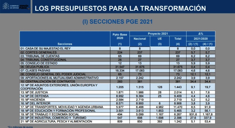 El proyecto de Presupuestos Generales del Estado aprobado en el Consejo de Ministros de ayer contempla una partida de 9.409 millones de euros para el ejercicio 2021, un incremento respecto al actual del 4,6 por ciento.Estos presupuestos considerados por el Gobierno “para la reconstrucción social y económica del país y transformar el modelo productivo” se caracterizan principalmente por “el mayor gasto social de la historia”, estando diseñados para combatir los efectos de la crisis provocada por el COVID-19 blindando el Estado del Bienestar y reactivando la economía. Incorporan 27.000 millones de euros procedentes de la Unión Europea.
