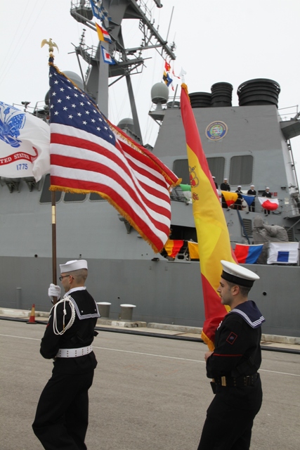 A la bienvenida oficial a la dotación, la precedió la de unos pocos familiares ya presentes en Rota, el resto irán llegando a partir del verano hasta completar un total de 1.800. Posteriormente se celebró una sencilla ceremonia en la que se interpretaron sendos himnos nacionales y en la que tomaron la palabra, además de los aludidos, el almirante de la US Navy para Europa y África, Bruce W. Clingan, y el Jefe de la Flota, almirante Santiago Bolíbar.