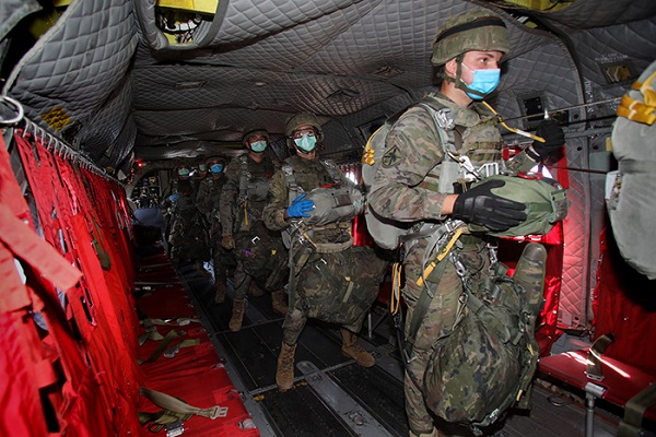 En esta ocasión, fue un lanzamiento paracaidista en apertura automática desde un helicóptero Chinook, en el que participaron alrededor de 70 militares. La diferencia respecto a las anteriores veces estriba en que se emplearon las medidas de autoprotección obligatorias: además de mantener las distancias de seguridad, se tomó la temperatura a todos los saltadores, que llevaban puestas las mascarillas higiénicas. Antes de embarcar, se desinfectaron las manos con gel hidroalcóholico y se pusieron los guantes de nitrilo. Aunque los Chinook pueden llevar alrededor de 20 paracaidistas, ahora es necesario dejar un asiento vacío de separación entre cada uno, por lo que la tripulación se redujo a la mitad.