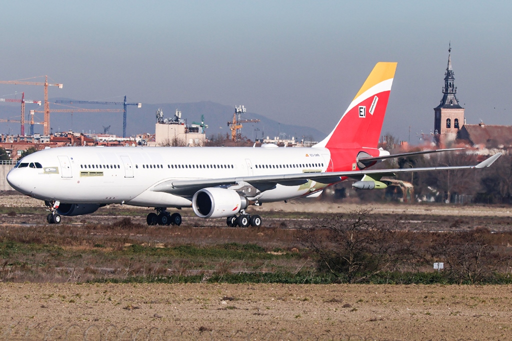 El futuro MRTT español, rodando en Getafe, todavía conserva buena parte del esquema de pintura de Iberia. (foto Rubén Galindo)