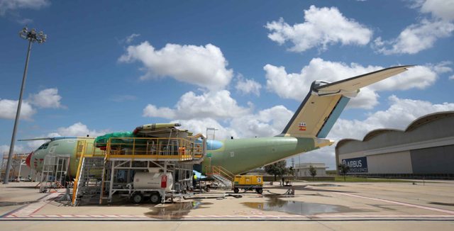 Gracias a una imagen de Airbus Defence & Space hemos podido ver, en la plataforma de la planta de San Pablo (Sevilla), el que será el primer A400M del Ejército del Aire, que luce como única marca una pequeña bandera de España y el numeral de fábrica MSN44 y, que se corresponde con el aparato número 44 montado. El avión está prácticamente acabado, aunque todavía no lleva instaladas sus cuatro hélices, una vez concluido el proceso, le quedarán por delante los vuelos de pruebas y aceptación, además de su paso por la cabina de pintura, donde saldrá ya luciendo el aspa de San Andrés en su cola y las demás marcas del Ejército del Aire.