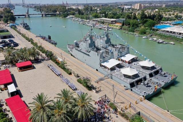 Fotografía: Dos más modernos BAM de la Armada atracados en un muelle sevillano del Guadalquivir, escenario de la gesta de Ramón Bonifaz. (foto Armada).
