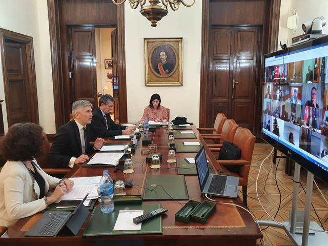Esta reunión se ha celebrado después de que el ministro dictase este domingo la orden por la que se establecieron los criterios de aplicación del Real Decreto del estado de alarma en el ámbito del Sistema Nacional de Protección Civil. Grande-Marlaska ha dirigido la reunión desde la sede del Departamento, acompañado por la subsecretaria del Interior, Isabel Goicoechea, y el director general de Protección Civil y Emergencias, Leonardo Marcos.