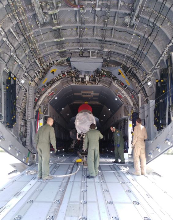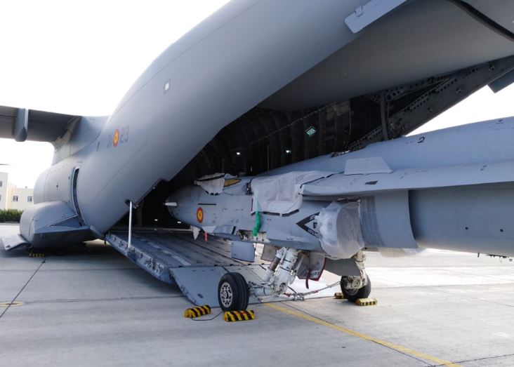 El EF-18 ya dentro de la bodega del A400M del Ejército del Aire. (foto: Ejército del Aire).