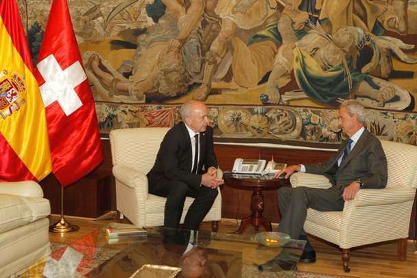 (defensa.com) El ministro de Defensa, Pedro Morenés, se ha reunido con Ueli Maurer, jefe del departamento federal de la Defensa, Protección de la población y Deportes de la Confederación de Suiza en un encuentro bilateral que ha tenido lugar en la sede del ministerio de Defensa. Los ministros junto con sus delegaciones han mantenido un encuentro de trabajo en el que han abordado asuntos relacionados con la cooperación militar presente y futura, la modernización de las FAS de ambos países y la situación de seguridad. Además, se han tratado los intercambios de fuerzas entre Suiza y España.
