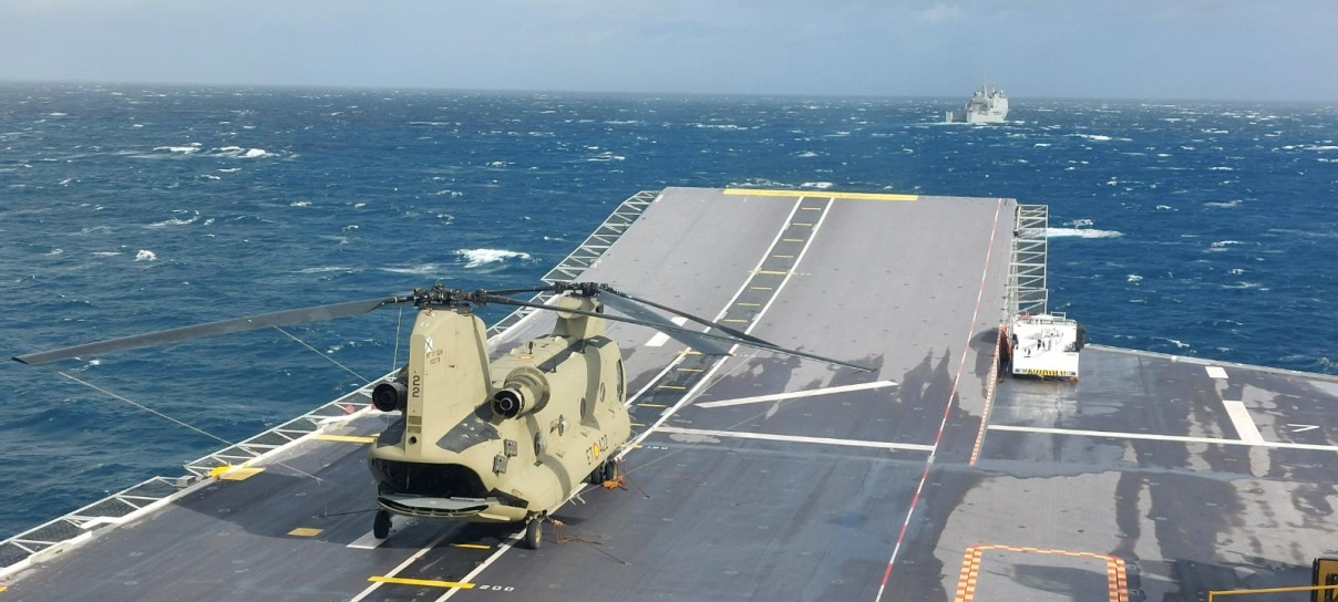 Uno de los CH-47F trincado en la cubierta del buque de asalto anfibio “Juan Carlos I” (foto FAMET)